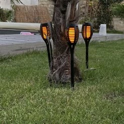 - Lot de 4 mini-piquets LED solaires effet Flamme, finition plastique noir